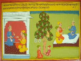 | Description / विवरण | Miniature painting based on Mahabharat - Ashramvas parva depicting Dhritrashtra advising Yudhisthir about the dharam of king. He stressed on value of discussion, a king should call meeting of ministers regularly. He compared spy with monkey and stressed on role of spy. At both extreme left and right, king is shown sitting with ministers and discussing. On tree with monkey and bird in cages are shown in middle of painting. Two men are shown sitting under tree. |