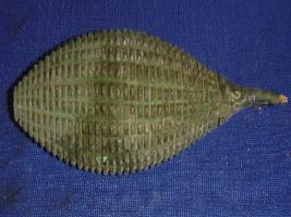 | Description / विवरण | Wooden bitter gourd, painted with green colour, having textures on the surface and a curved stem. |