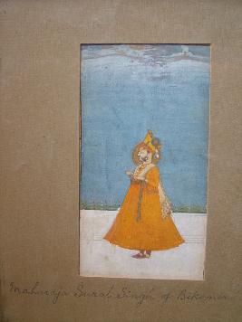 | Description / विवरण | This is a painting of Maharaja Surat Singh of Bikaner in standing posture. He is wearing yellow colour tunic, a pair of shoes and Turban. It has a light blue colour back ground. It is mounted in a frame. |