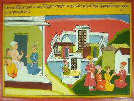 | Description / विवरण | Miniature painting based on Mahabharat - Ashramvas parva depicting Dhritrashtra telling Yudhisthir about king s duty at the right part. King should undertake servants with good background which would safeguard his kingdom. |