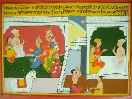 | Description / विवरण | Miniature painting based on Mahabharat - Ashramvas parva depicting Dhritrashtra sitting with Gandhari and preaching Yudhisthir who is sitting along with his brothers. He asked Yudhisthir to give respect to all. He told Yudhisthir that he has eight kingdoms and big treasury. He should follow the path of Dharma and ask for elder s advice in decision making. |