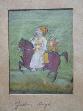 | Description / विवरण | In this painting Guder Singh is shown on a horse. The is in running posture. He is in white tunic with elbow turban, he is holding a flower in his right hand. A chauri bearer is also shown. It is mounted in a frame. |