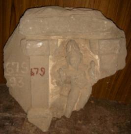 | Description / विवरण | Sculptured architectural fragment of probably Agni in standing position having bearded face. The legs from knees are missing. |