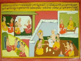 | Description / विवरण | Miniature painting based on Mahabharat - Ashramvas parva depicting Vyas talking to Yudhisthir and telling him that its kings duty to die either in war or in vana. He told him that his father Pandu performed many yagna, gave daan and enjoyed his life in earth. Like wise, Dhritrashtra also gave many daan. |