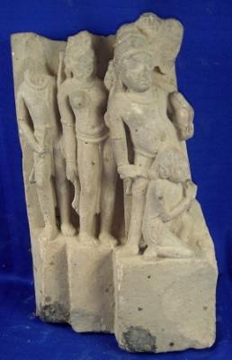 | Description / विवरण | Sculptured architectural fragment, probably lower part of an image depicting four attendants. Three of them are male attendants and one is female attendant, whose face is chopped off. One at the left side is worshipping the main deity which is missing. |