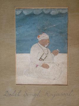 | Description / विवरण | This is a painting of Dalel Singh Rajawat in sitting posture. He is wearing white tunic. A katar is on his waist. He has a long moustache with a turban. He seems to be an aged person. It has blue colour back ground. It is mounted in frame. |