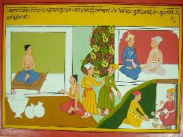 | Description / विवरण | Miniature painting based on Mahabharat - Ashramvas parva. The painting depicts that Dhritrashtra is talking Yudhisthir while Yudhisthir make donation to the Brahman which was not done by Duryodhana. |