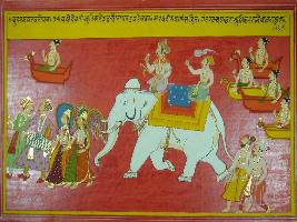 | Description / विवरण | Miniature painting based on Mahabharat - Udyam parva. Indra giving to Swarg lok. He is shown sitting Airavat elephant Gods are following in their viman. in front of Indra, Gandharva and Apsara are shown walking, and playing musical instrument. |
