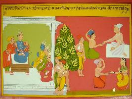 | Description / विवरण | Miniature painting based on Mahabharat - Ashramvas parva. The painting depicts that Dhritrashtra and Gandhari are making donation to people while Pandavas are seen in the other part of the painting sitting in the palatial balcony. |