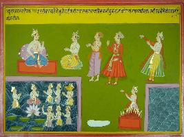 | Description / विवरण | Miniature painting based on Mahabharat - Udyam parva. It depicts Digpala including Kuber came to Indra and told him that king Nahuk was given curse by Agni. Then Indra gave Digpalas some work. |