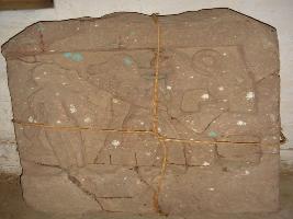 | Description / विवरण | An architectural fragment, probably a niche of wall, depicting deities male which are completely defaced and mutilated one of them is fighting with a lion. |