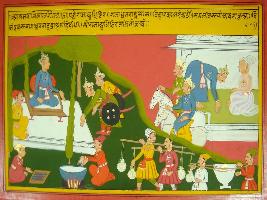 | Description / विवरण | Miniature painting based on Mahabharat - Ashramvas parva. The painting depicts that Yudhisthir paying respect to Dhritrashtra while on the other side. king Yudhisthir is sitting on throne and two brother Nakul and Sahdev is paying respect to him. while peoples are busy in preparing meal. |