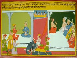 | Description / विवरण | Miniature painting based on Mahabharat - Ashramvas parva. The painting depicts that Yudhisthir is talking with Sanjay and Vidur while in the other hand Pandavas are seen with Dhritrashtra. |