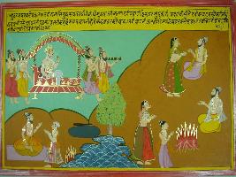 | Description / विवरण | Miniature painting based on Mahabharat - Udyam parva. It depicts king Nidhukh sitting on Paalki and Vinsayat sage carrying Paalki to Sukhpal. It also depicts Indrani talking to sages. |