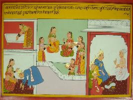 | Description / विवरण | Miniature painting based on Mahabharat - Ashramvas parva. The painting depicts that Pandavas are talking with Dhritrashtra while Yudhisthir is taking blessings from Gandhari by touching her feet. |