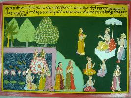 | Description / विवरण | Miniature painting based on Mahabharat - Udyam parva. It depicts a pond full of lotus and king Nidhukh is sitting on each besides it. Indra emerges from pond and is talking to females. |