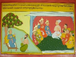 | Description / विवरण | Miniature painting based on Mahabharat - Ashramvas parva. The painting depicts that Vaispayan informing Janmejaya that Pandavas get their territory while on the painting Pandavas are seen talking with Dhritrashtra and Gandhari. |