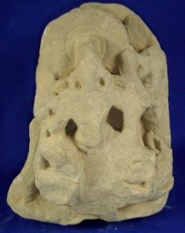 | Description / विवरण | Architectural fragment depicting a seated figure which is chopped off. Behind his head floral designed nimbus is seen. To his left another standing human figure probably an attendant is seen which is also chopped off. |