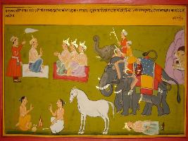 | Description / विवरण | Miniature painting based on Mahabharat - Rajdharma parva. A king is told to have performed ten Ashwamegh yagna. A king is depicted with three royal persons. Three elephant and a lion also is depicted behind the horse of Ashwamegh. |