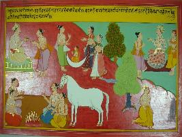 | Description / विवरण | Miniature painting based on Mahabharat - Udyam parva. It depicts Indra performing Ashwamegh yagna to get rid of sin of Brahman hatya. To get rid of Brahman hatya he goes to rivers, mountains and kept himself away from his wife later by seeing glory and king Nidhukh he moved ahead. |