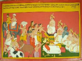 | Description / विवरण | Miniature painting based on Mahabharat - Ashramvas parva depicting Yudhisthir giving many elephants, horses, cows, wealth etc. as daan to Brahmans in the name of Dhritrashtra. He is also giving cloths to women as daan in the name of Kunti and Gandhari. |