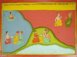 | Description / विवरण | Miniature painting based on Mahabharat - Ashramvas parva depicting Narad telling Yudhisthir that after the renunciation, Dhritrashtra, Kunti, Gandhari and Sanjay went to the bank of Ganga, met many sages and afterwards gone to Himachal. |