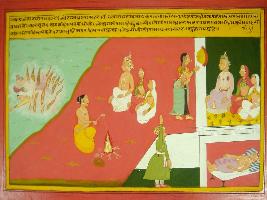 | Description / विवरण | Miniature painting based on Mahabharat - Ashramvas parva depicting at the upper right death of Kunti. Dhritrashtra and Gandhari are sitting in front of the cremation. At the centre, Arjun performed yagna same way Dhritrashtra performed Agnihotra yagna and Pandavas are mourning the death of Kunti. |