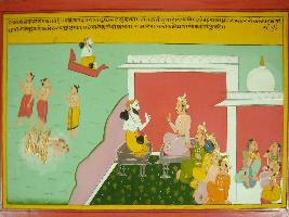 | Description / विवरण | Miniature painting based on Mahabharat - Ashramvas parva depicting Narad telling Yudhisthir about the journey of Dhritrashtra, Gandhari and Kunti. He says that Sanjay had seen ashes of their mother, Dhritrashtra and Gandhari. By hearing this the whole palace falls in grief. |
