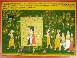 | Description / विवरण | Miniature painting based on Mahabharat - Ashramvas parva depicting Dhritrashtra after taking bath in Ganga coming towards ashram when fire occurred and covered the whole forest. In that fire Kunti, Dhritrashtra and Gandhari denunciated their body. Sanjay is depicted crying in their death. |