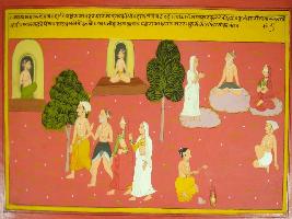 | Description / विवरण | Miniature painting based on Mahabharat - Ashramvas parva depicting after leaving Gangadwara Dhritrashtra with others reached Haridwar where he did hard penance. Kunti and Gandhari also did fasting and on the sixth day Sanjay performed yagna. After that Dhritrashtra moved forward with Vidur, Kunti and Gandhari. |
