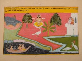 | Description / विवरण | This painting represent Sita and Ramchandra who are seated on a boat. Besides in it Brahma has been shown on a lotus. Also another mythological couple has been shown in it moreover two birds, one is having a fish with the help of beak can be seen. |