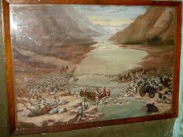 | Description / विवरण | A painting of a battle scene, depicting the battle fought between the widow of Jaswant Singh and Mughals in the bank of river Arak. |