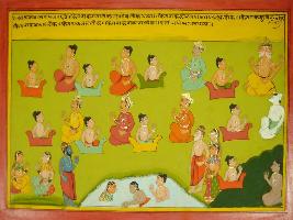 | Description / विवरण | Miniature painting based on Mahabharat - Ashramvas parva. The painting depicts that many people went to Devlok, Kauravas and Pandavas went to Brahmlok, and some in Kuberlok and some in Baronlok. This all happen after death according to their performance in the life. |