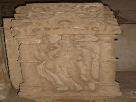 | Description / विवरण | A sculptured architectural fragment, depicting, a female chanwari bearer, standing in tribhanga pose, in a niche. She is facing towards the right and holding a chanwari in the right hand and tussle of the drapery in the left hand part of the hand is broken . She is wearing an elongated hairstyle, earrings, necklace with tussle, armlets, bracelets, girdle with tussles hanging over the thighs and lower dress. |