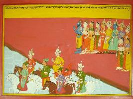 | Description / विवरण | Miniature painting based on Mahabharat - Ashramvas parva. The painting depicts that after meeting to Pandavas Karna, Abhimanyu, all are again going back to Ganga. |