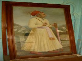 | Description / विवरण | Full length, portrait of Sawai Raja Shur Singhji, standing facing towards left and holding a flower in the right hand and along straight sword in scalet scabbard , in the left hand. He is wearing a scarlet turban wiht jewelled Sarpech and Kalaghi , three strands of pearl necklace, and an ankle-length jama. |