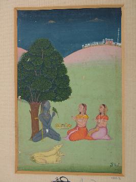 | Description / विवरण | In this painting, a sadhoo is sitting below a tree, he has only a kilt, a parrot is sitting on his right hand two female are sitting in front of him in kneeling posture. Two dogs are in laying posture |
