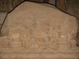 | Description / विवरण | A sculptured architectural fragment, depicting a male deity, standing in tribhanga pose and flanked by female attendants on both sides, in a niche. The upper portion from the head and arms except the lower left holding drapery are chopped off. He is wearing armlets, bracelets, girdle with tussels hanging upto the knee, and anklets and drapery around the legs. Two female chanwari bearers on right side and one on left side are standing in tribhanga, at the lower portion. |