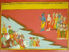 | Description / विवरण | Miniature painting based on Mahabharat - Ashramvas parva depicting Pandavas going towards the bank of Ganga and Bhishma, Drona and other people are coming to see them. |