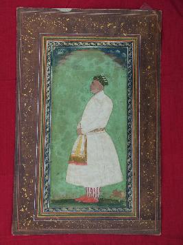 | Description / विवरण | This is a painting of a king. He is wearing white tunic and striped, Pajama, decorated turban and with green and cream colour. He is shown in red colour shoes. Back ground of this painting is light green. |