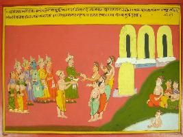 | Description / विवरण | Miniature painting based on Mahabharat - Ashramvas parva. king Yudhisthir is depicted giving the utensils of gold and other things to rishis, Dhritrashtra is depicted bathing in the river and Kunti and Gandhari depicted sitting on the bank. |