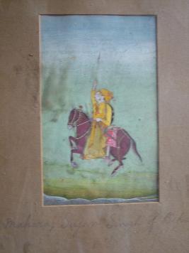 | Description / विवरण | Maharaja Sujan Singh of Bikaner is shown on a horse back as a hero. He wears a yellow colour tunic and yellow colour turban. He is holding a Javelin long Sword and a shield is hanging on his back. The horse is decorated with ornaments and in running posture. It is mounted in a frame. |