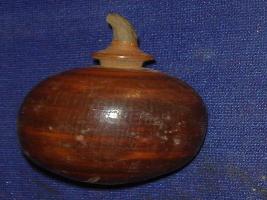 | Description / विवरण | Brinjal, made of wood, of round shape in brown colour with short, curved green stem. |