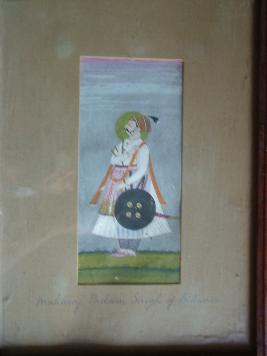 | Description / विवरण | It is a painting of Maharaja Padam Singh of Bikaner. Shield and Sword is hanging on his waist. He is wearing a transparent white tunic, golden colour turban with feather. A pair of shoes in red colour. A halo behind in his head. It is mounted in a frame. |