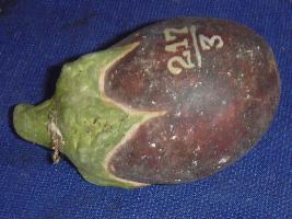 | Description / विवरण | Brinjal of purplish black colour and green stem, made of wood. |
