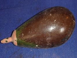| Description / विवरण | Brinjal, made of wood, having bulbous shape of black colour and green stem. The colours are flaking on the upper part. |