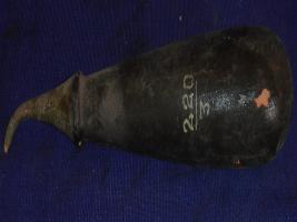 | Description / विवरण | Brinjal of black colour, long in shape, made of wood, and having a curved stem of green colour. |