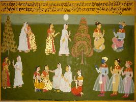 | Description / विवरण | Miniature painting based on Sanskrit drama Malti Madhav depicting Kamandaki talking to Malti and consoling. On the otherhand Madhav talking to Makarand about the faith of his love with Malti. |