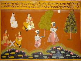 | Description / विवरण | Miniature painting based on Sanskrit drama Malti Madhav depicting Kamandaki saying that since when Malti has seen Madhav, she lost her counciousness and fall in love with Madhav. |