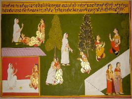 | Description / विवरण | Miniature painting based on Sanskrit drama Malti Madhav depicting Budhirakshyata coming to Avalokita and asking about Kamandaki. Then she moves to Malti and Kamandaki comes to Madayantika and tells her about the condition of Malti. |